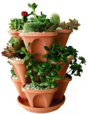 Stack-A-Pot by Malhotra Plastic - is perfect for your deck, patio, front porch, balcony or inside your home. The multi-tiered planter is crafted from durable, U.V. protected plastic and can withstand all four seasons outdoors! With a , the Stack-A-Pot is ideal for the creative gardener. You can even add more layers by purchasing multiple units! Your planter includes three layers plus a base Plus one chain set for hanging ; each layer holds three plants. Imagine your home cascading with colorful flowers, tasty herbs, succulent strawberries, or plump tomatoes. The layers stack upward, saving you valuable space, and collapse again for easy storage! The perfect gift for gardeners of all levels.
